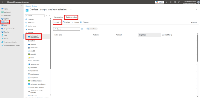 - Navigate to Devices → Scripts and Remediations → Platform Scripts.